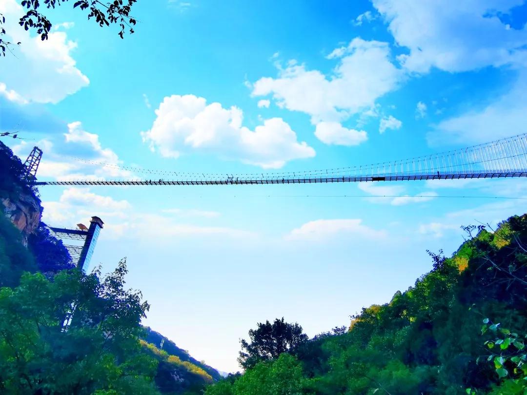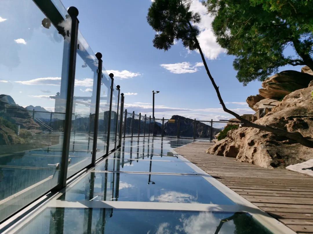 清凉谷玻璃栈道,像一条透明的小游龙,盘在悬崖峭壁之上,走在上面,可以看山峦起伏,绿野葱葱,秀美景色尽收眼底。